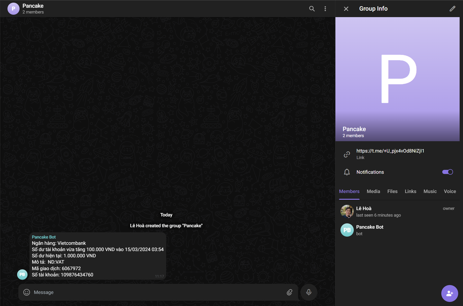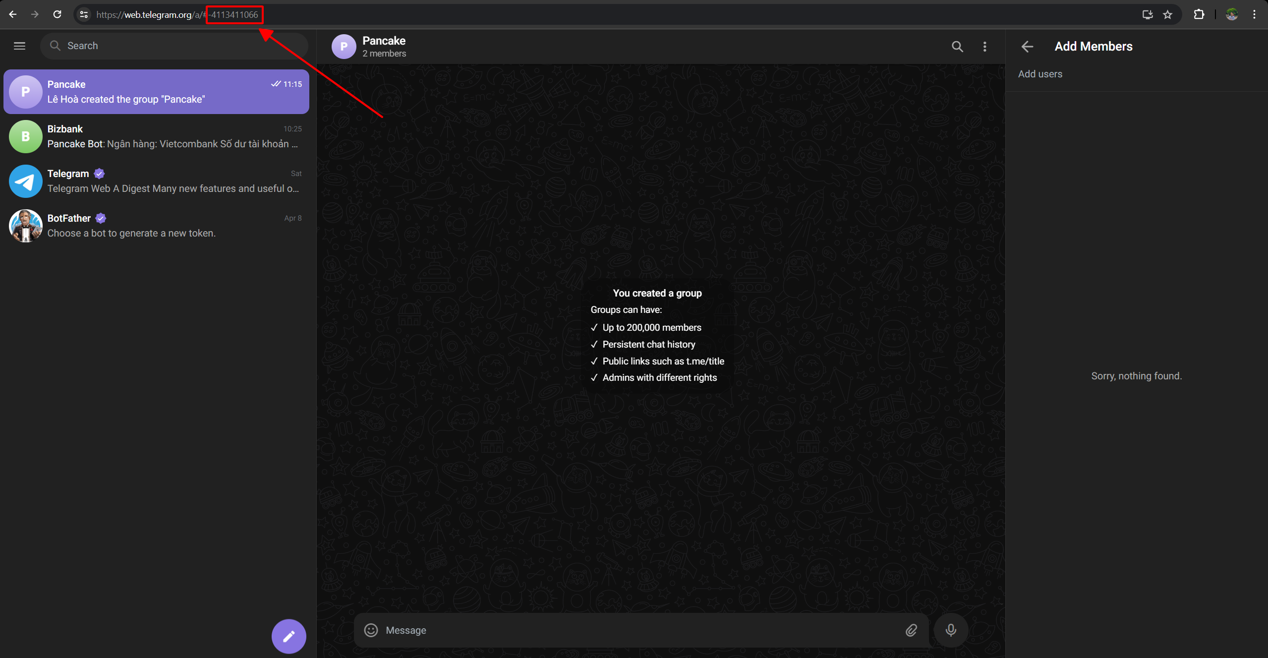 Đầu tiên, bạn tạo group chat ở Telegram  và thêm Pancake bot (@comcake\_bot) vào group đó. Con bot này của Pancake có tác dụng gửi thông báo biến động số dư.