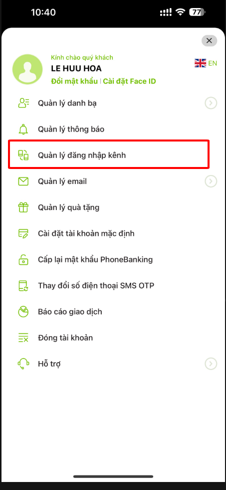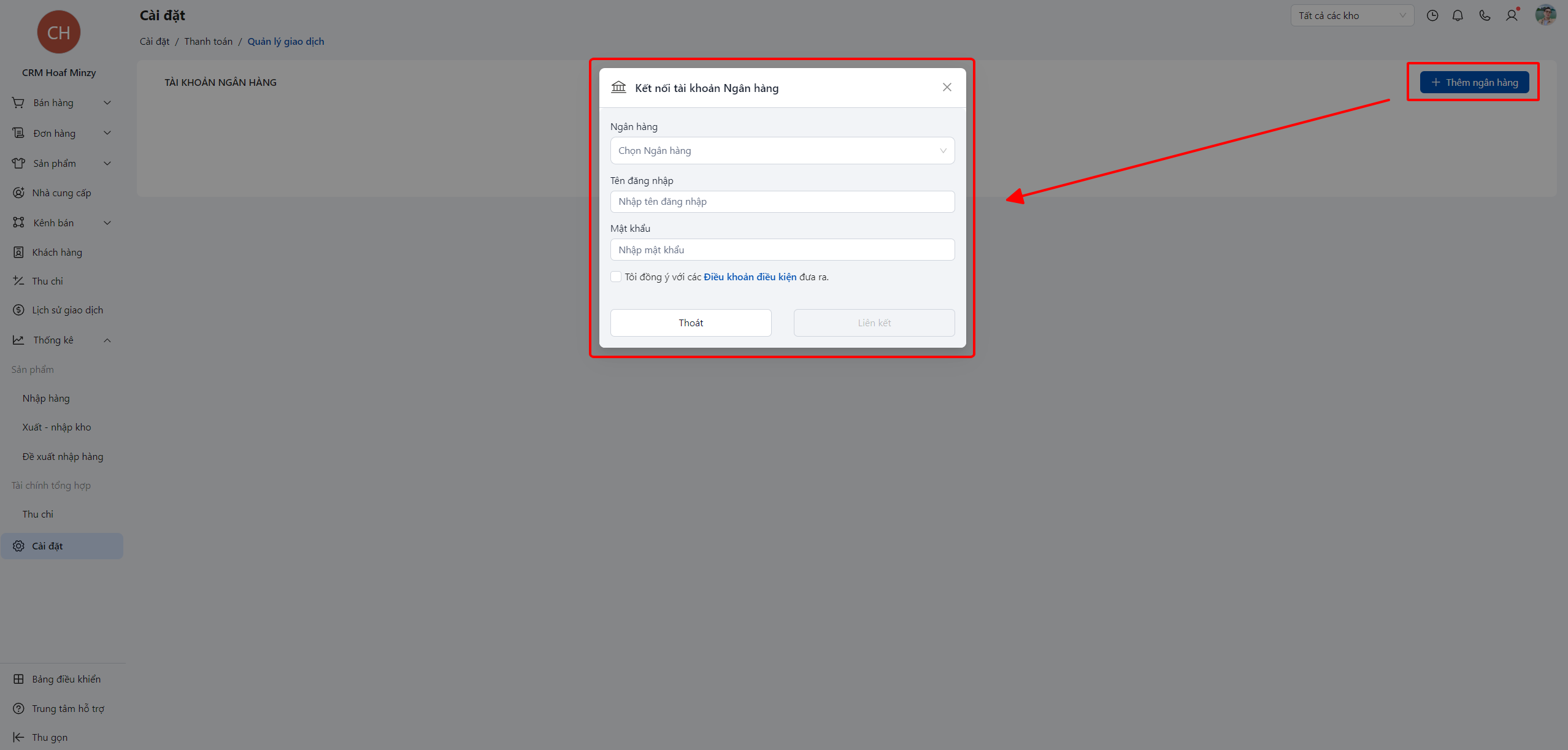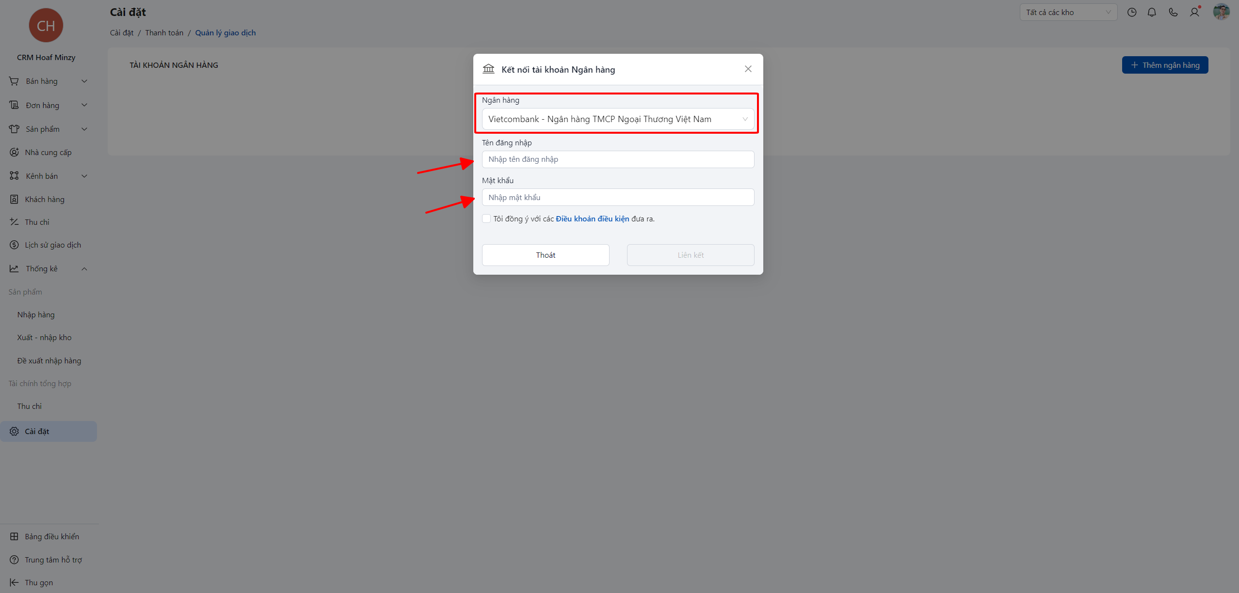 Tương tự như cách kết nối của các ngân hàng trên, bạn cần nhập tài khoản mật khẩu của ngân hàng vào mục quản lí giao dịch.