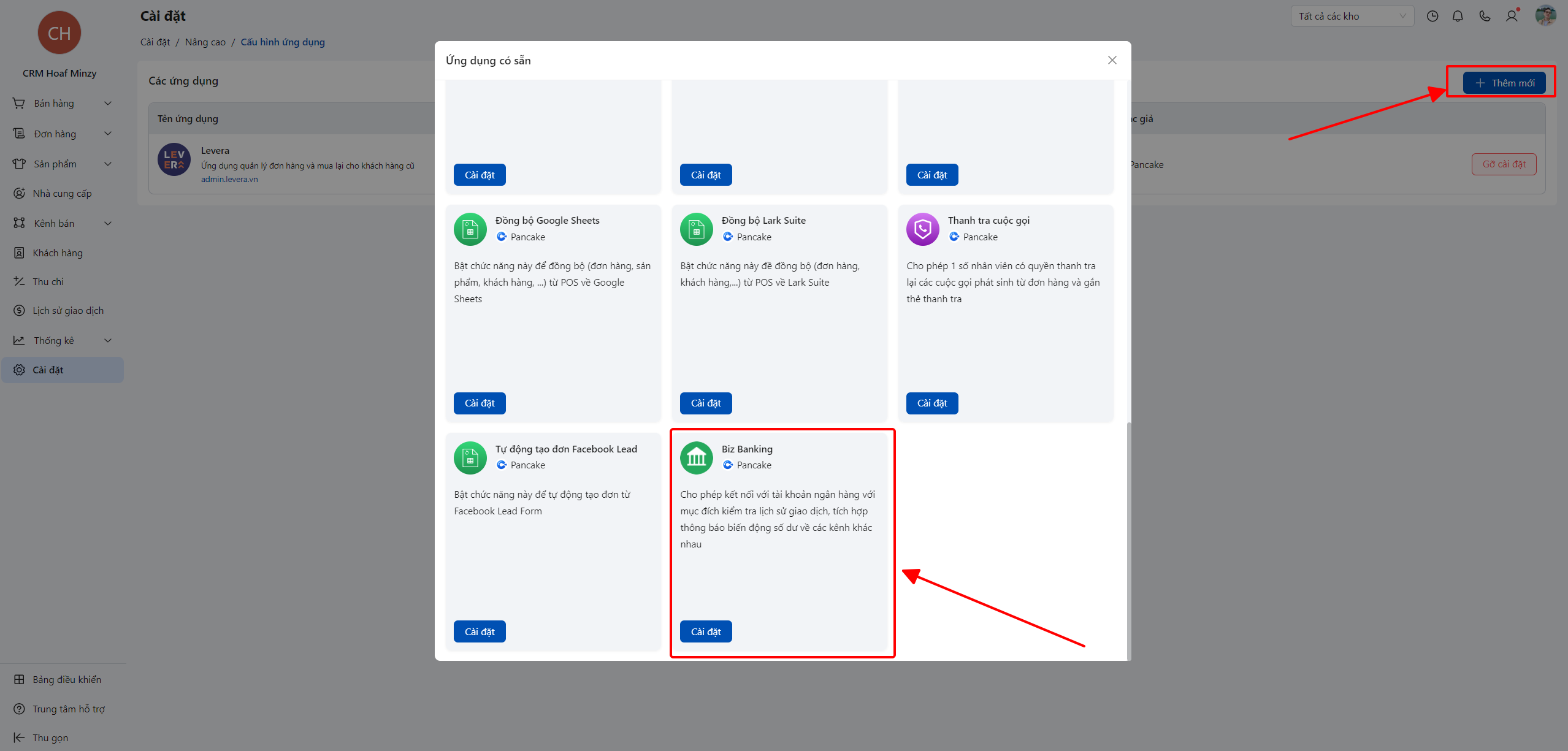 Để kết nối được với các ngân hàng, trước tiên bạn cần phải cài đặt ứng dụng Biz banking ở mục cấu hình ứng dụng.