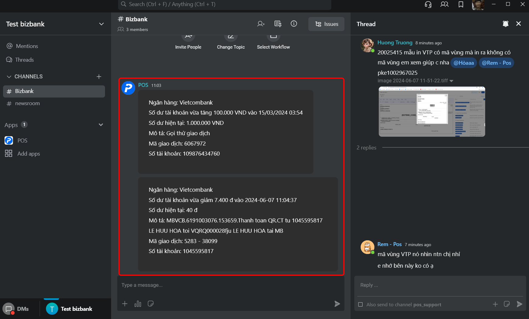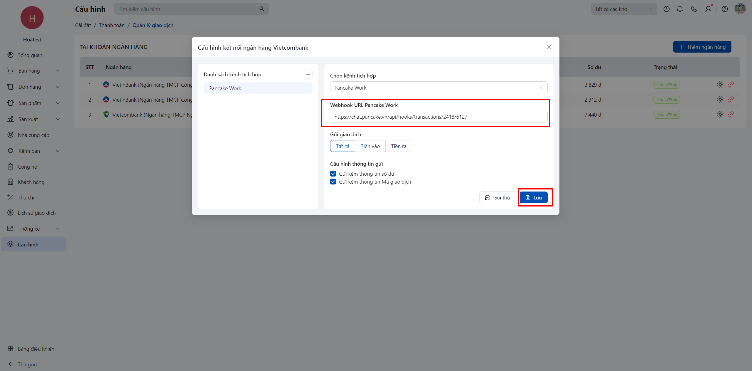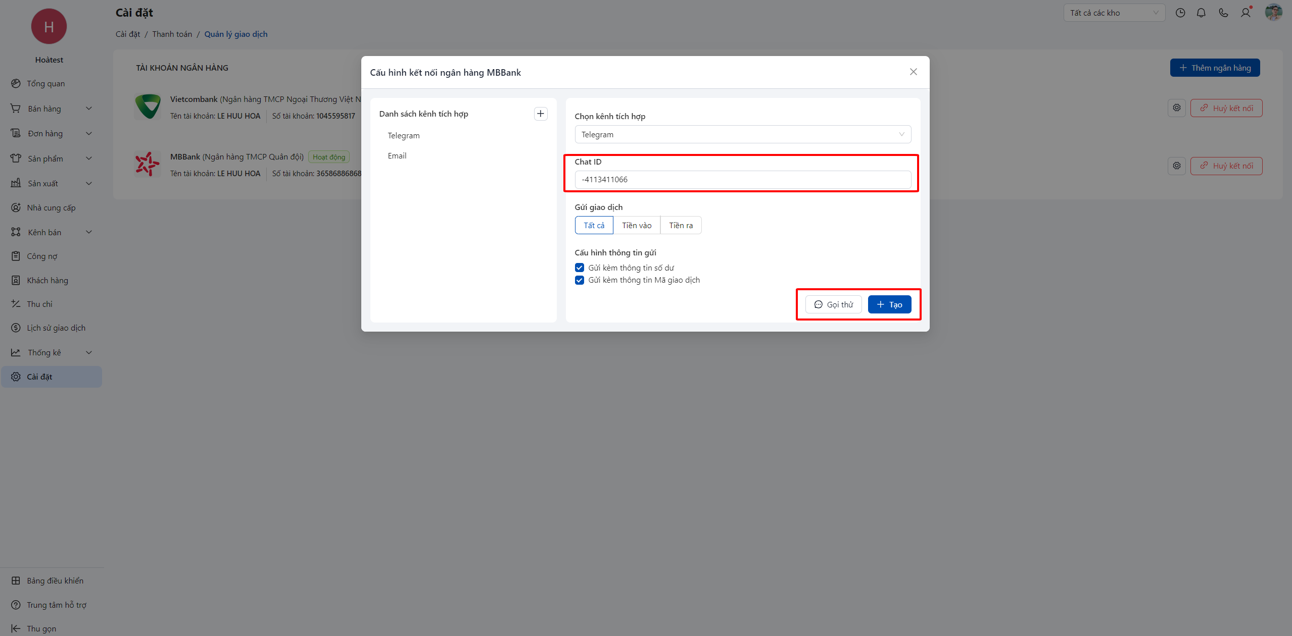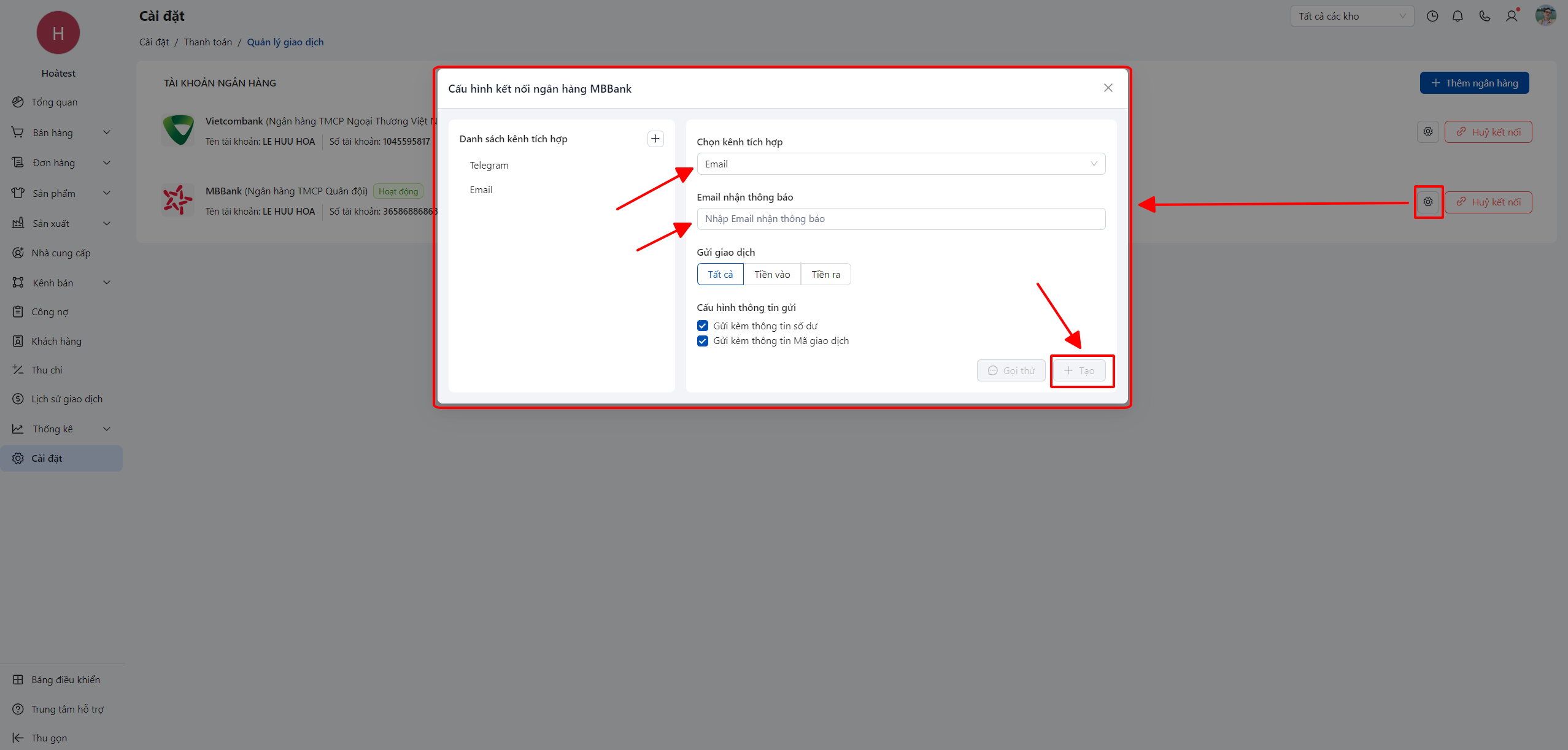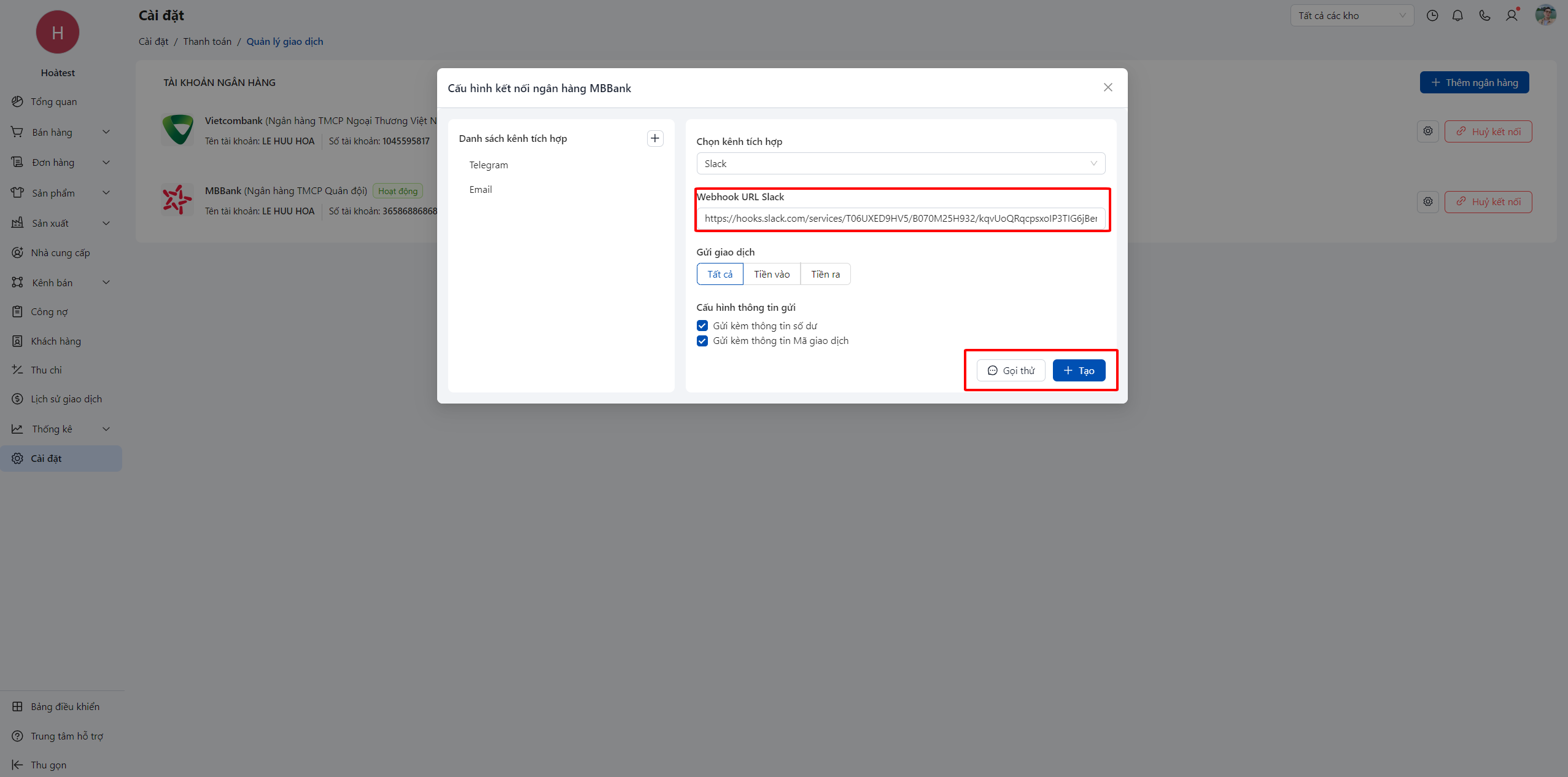 Sau khi đã liên kết thành công ngân hàng vào POS, bạn cần cấu hình kênh thông báo để khi có biến động số dư. Ngoài giao dịch được đồng bộ về POS thì đồng thời sẽ thông báo vào các kênh tích hợp mà bạn đã cài đặt.