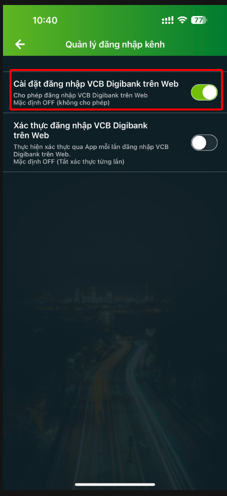 <figure><img src="https://922161841-files.gitbook.io/~/files/v0/b/gitbook-x-prod.appspot.com/o/spaces%2FbSqXsV7bK8xLDX1Kg7J5%2Fuploads%2FU6MwyPVSCPbsxv3GFy1R%2Fimage.png?alt=media&#x26;token=2d188dfe-942c-4d15-a7ad-bba33f22af99" alt=""><figcaption><p>Cho phép đăng nhập ngân hàng qua Web</p></figcaption></figure>