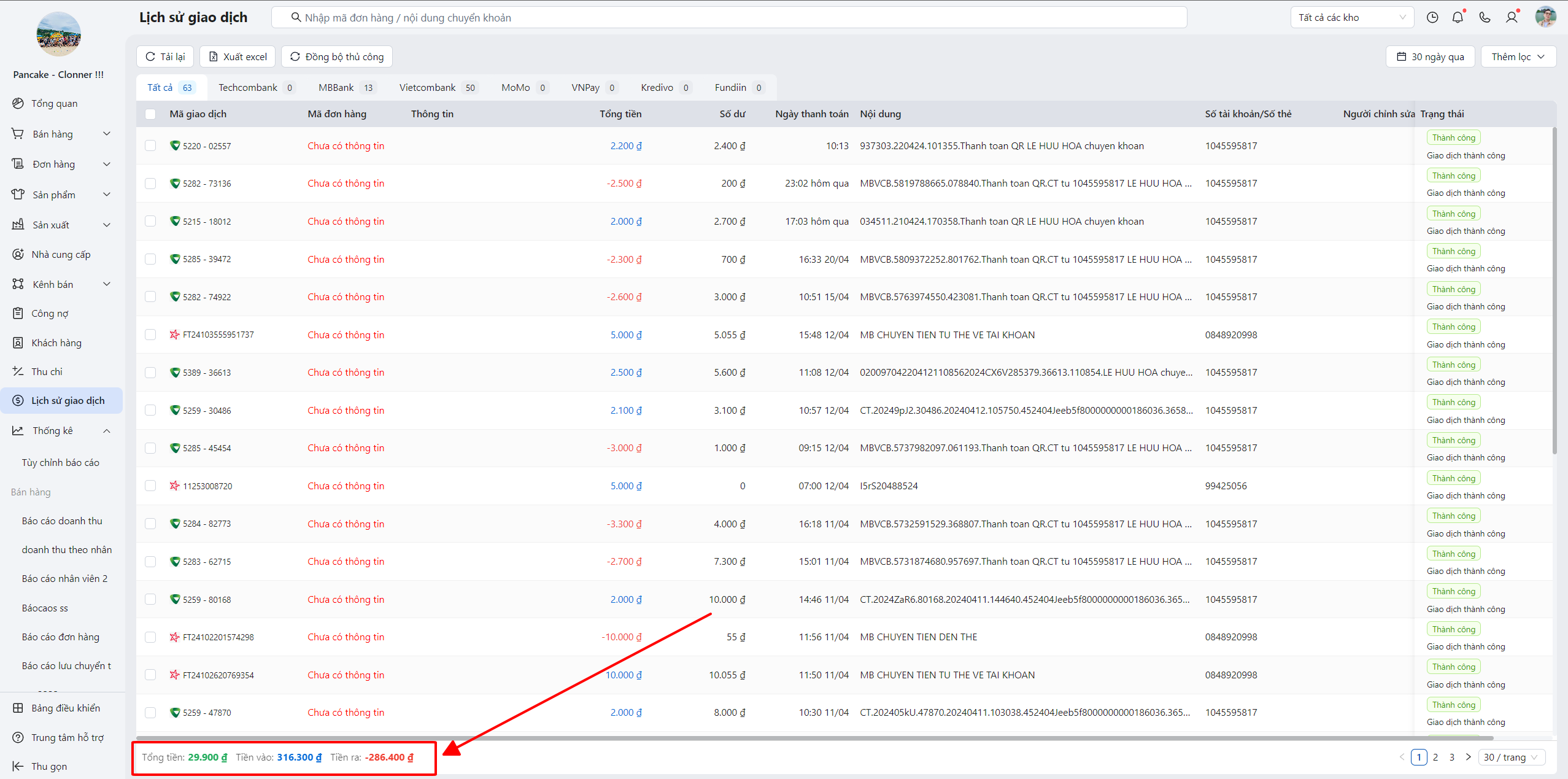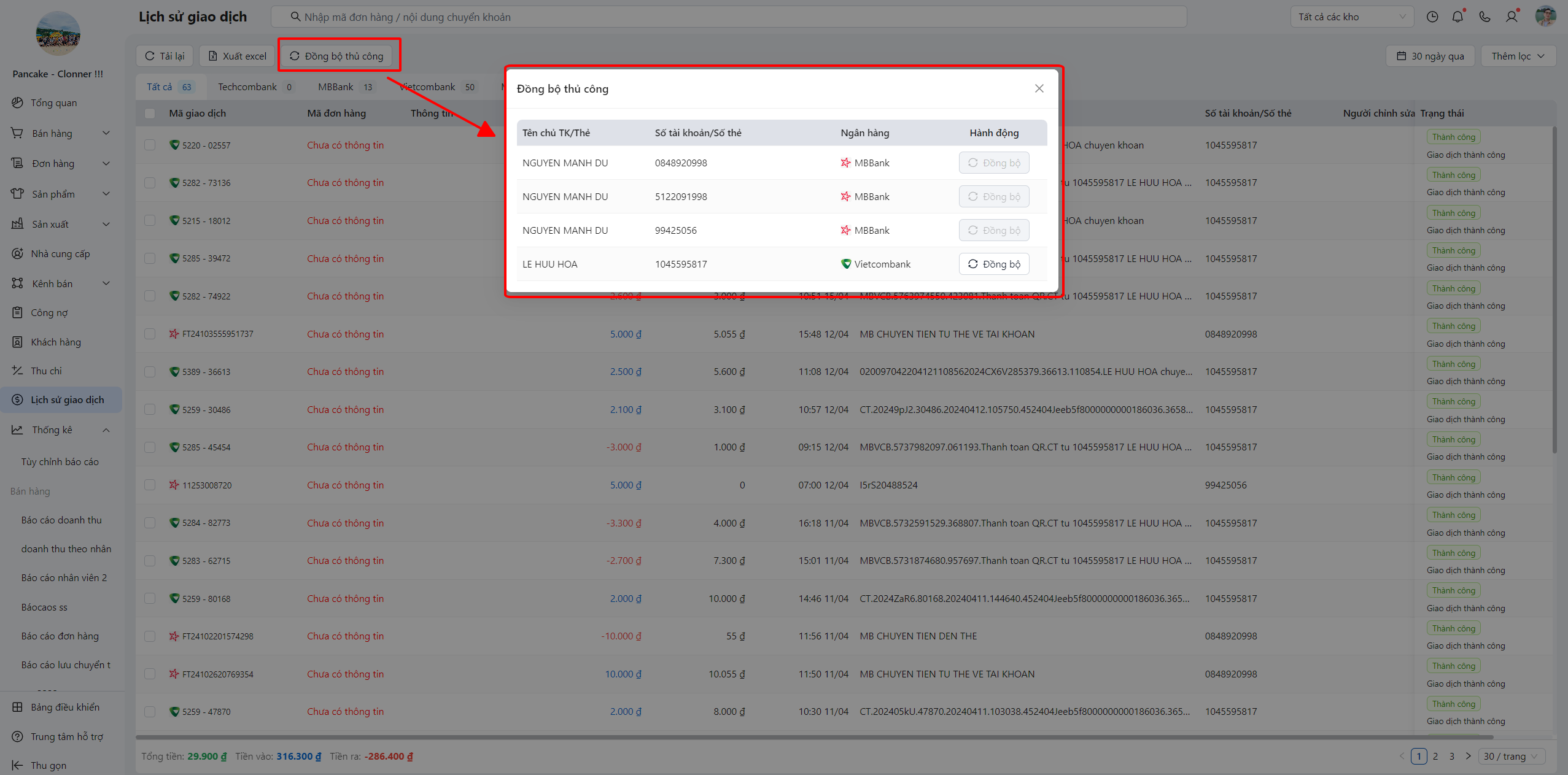 Ngoài việc tự động đồng bộ giao dịch từ ngân hàng, POS cho phép bạn đồng bộ thủ công trong trường hợp bạn không thấy giao dịch mới phát sinh trong Lịch sử giao dịch.