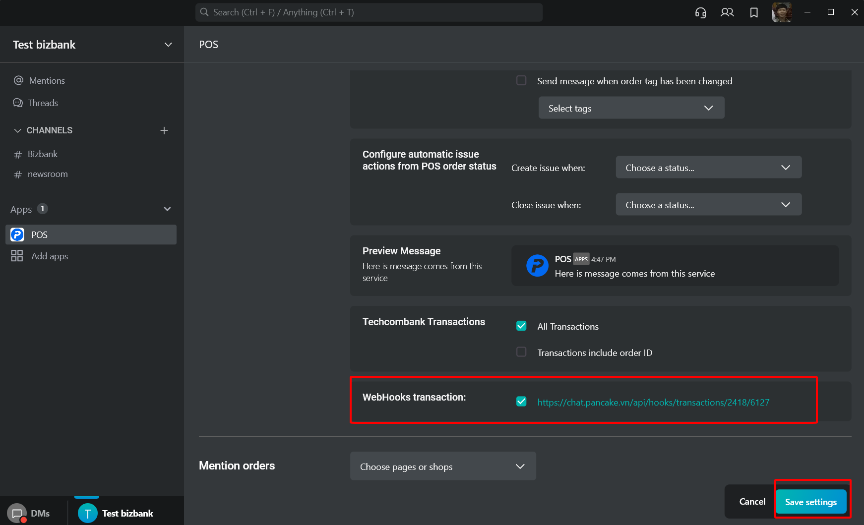 Cuối cùng, bạn thiết lập thông tin kênh thông báo tại POS. Dán đường dẫn webhook URL và bấm tạo để hoàn thành thiết lập.