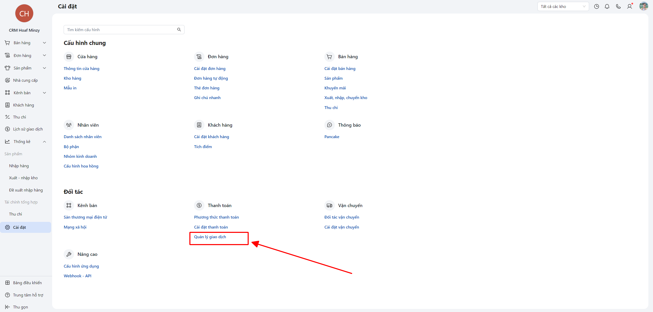 Sau đó bạn vào mục quản lí giao dịch để bắt đâu thêm ngân hàng vào POS.