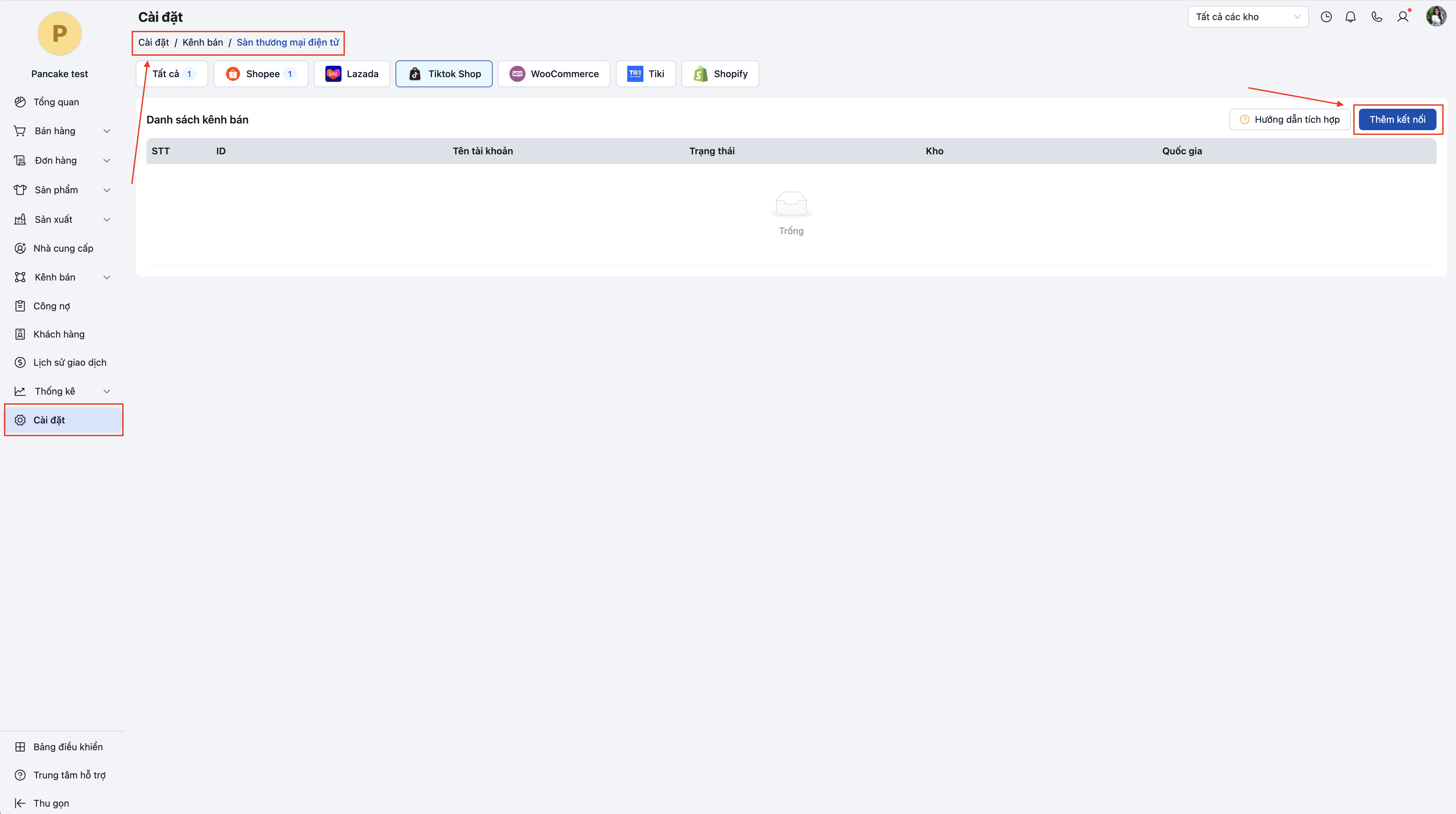 Bước 2: Cài đặt đồng bộ Tiktok Shop với kho hàng ở POS: