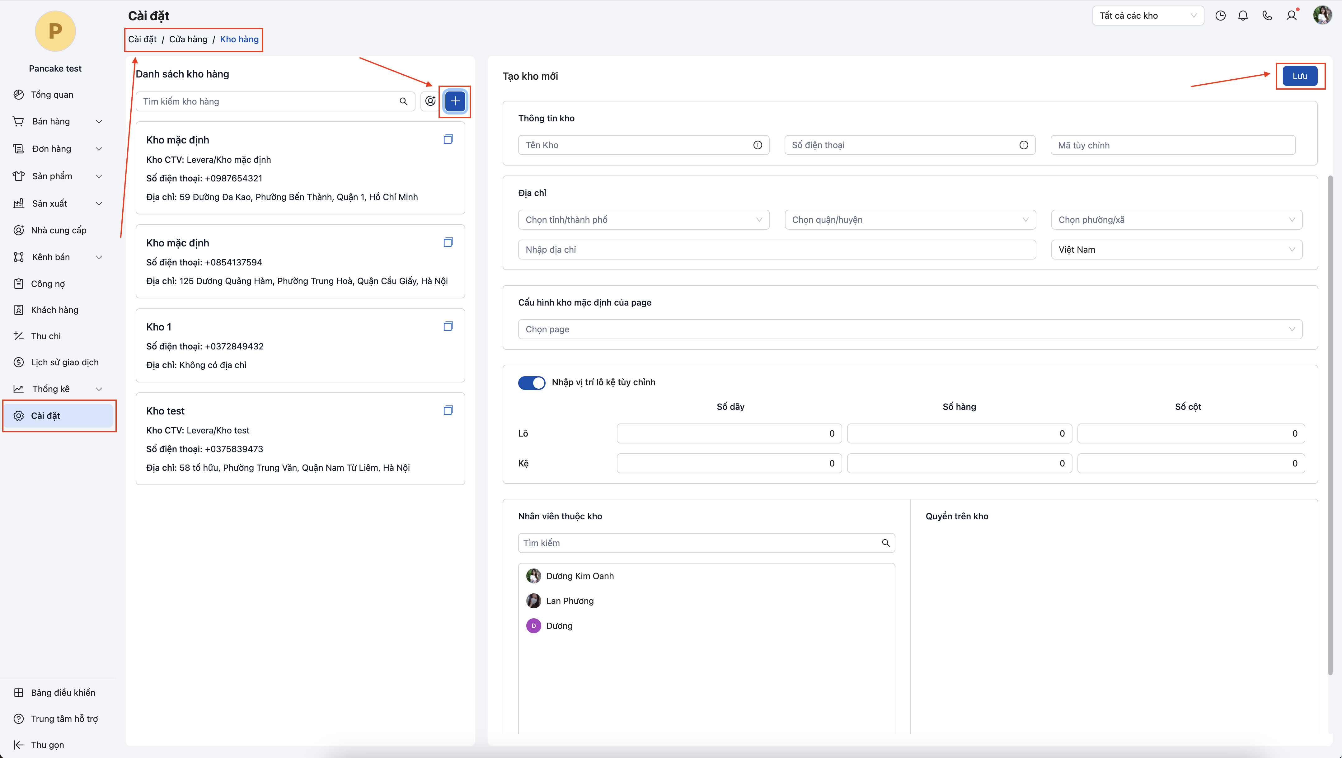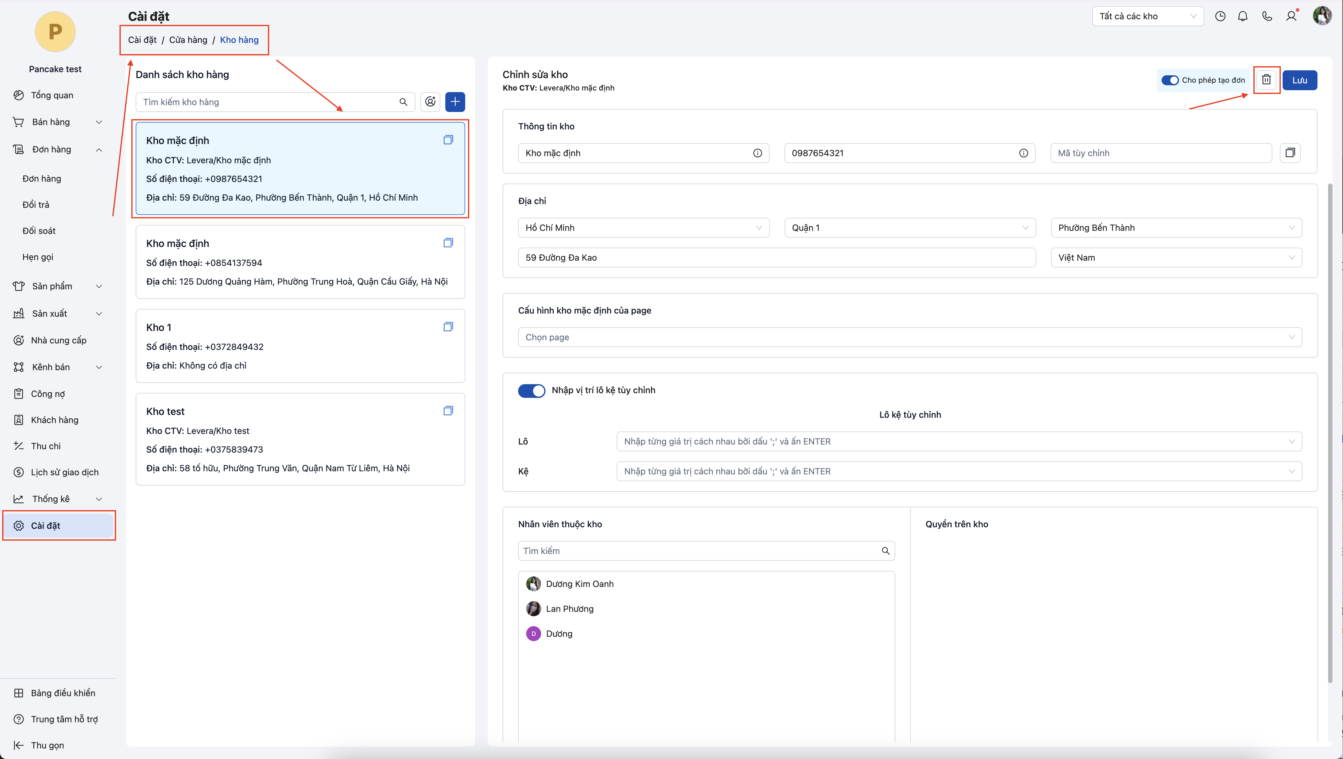 **Xoá kho:** Hành động **không thể hoàn tác** này sẽ xoá vĩnh viễn thông tin kho hàng, cấu hình kho và tồn kho của các sản phẩm thuộc kho.